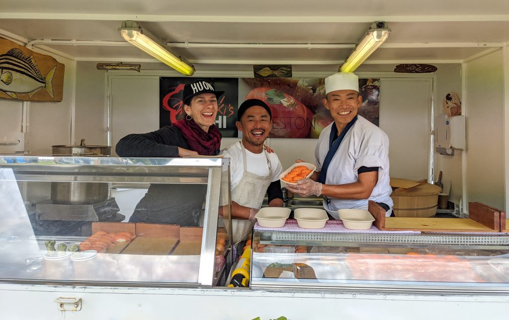 Business was slow to begin with. In the early days, Masaaki would sit with his few customers – picking up new English words. Some would come just to watch him sharpen knives and carve with skills crafted over three decades. Fast forward a couple of years and the line for Masaaki’s sushi became 30-minutes deep and foodies hailed from as far as France and Sweden to join the queue. Word of mouth, a cult following at farmgate markets and a feature on British Chef Rick Stein’s TV show catapulted Masaaki well out of his tiny sushi bar premises.