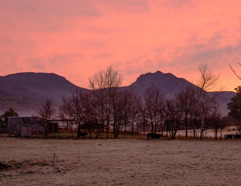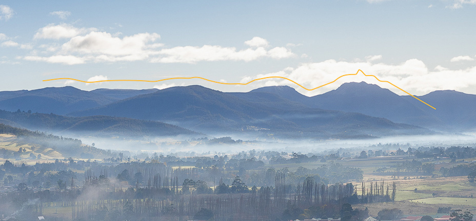 Locals say Sleeping Beauty looks different through the seasons, whether lit up by a warming sun, shrouded by a misty veil or framed by dramatic clouds. The poetic name for the bordering mountain range is a lovely sentinel over the acres of Huon Valley orchards, nestled under her reclining profile.