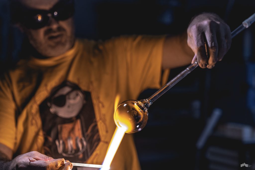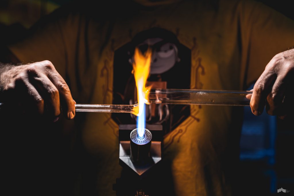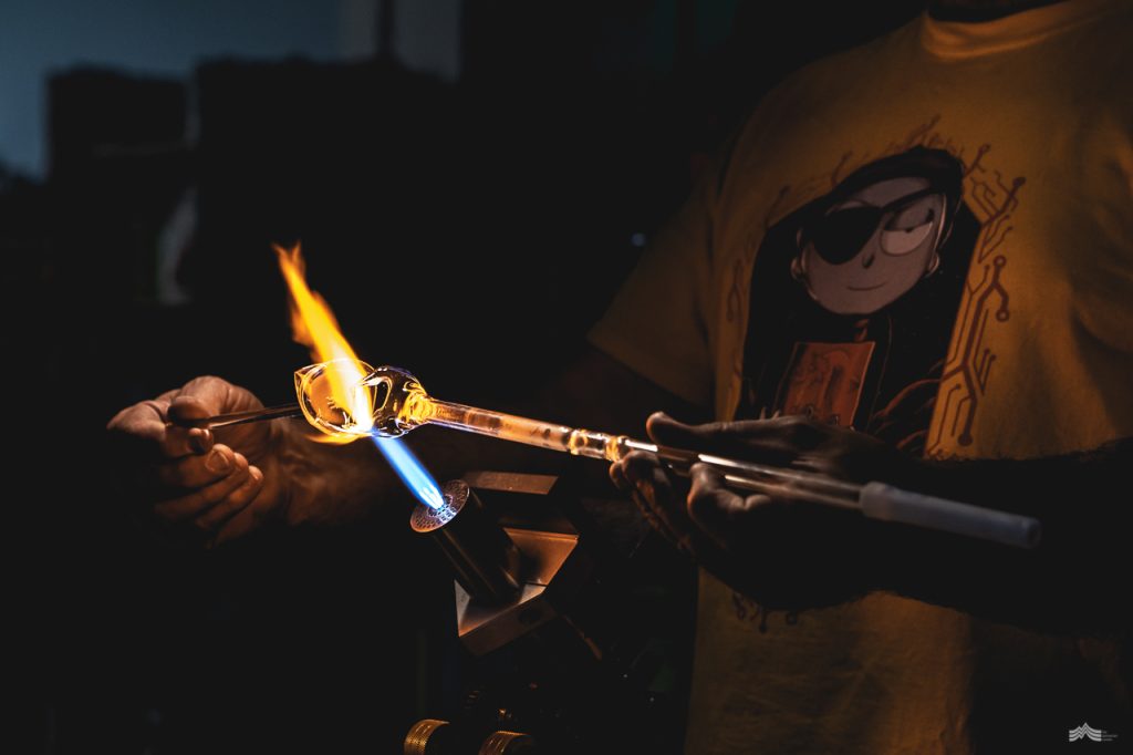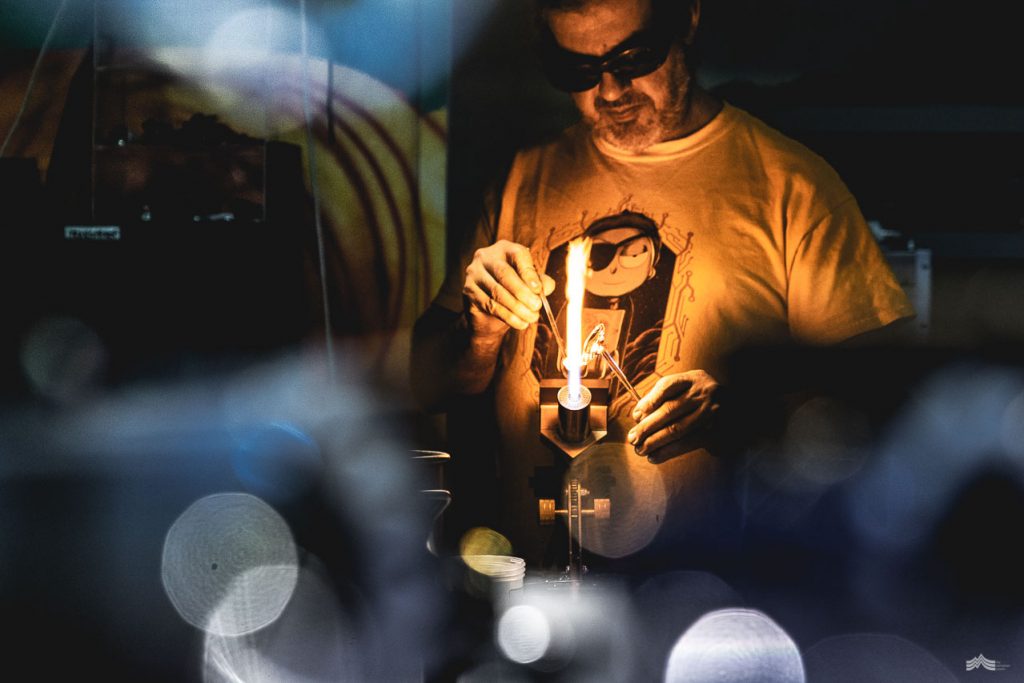 Working with glass had always lingered in the back of Craig’s mind. “I’ve always been fascinated with it,” he nods enthusiastically. “I can clearly recall walking past a glass shop as a kid and it just blowing my mind. I had always just assumed it was out of my league, and I’d never crossed paths with anyone that could teach me.” With a glint in his eye Craig continues, “But one day I just jumped in and bought one hundred dollars’ worth of glass rods and got my hands on a plumbers gas torch. Within ten minutes I knew that this was for me,” he smiles. “I was hooked.”
