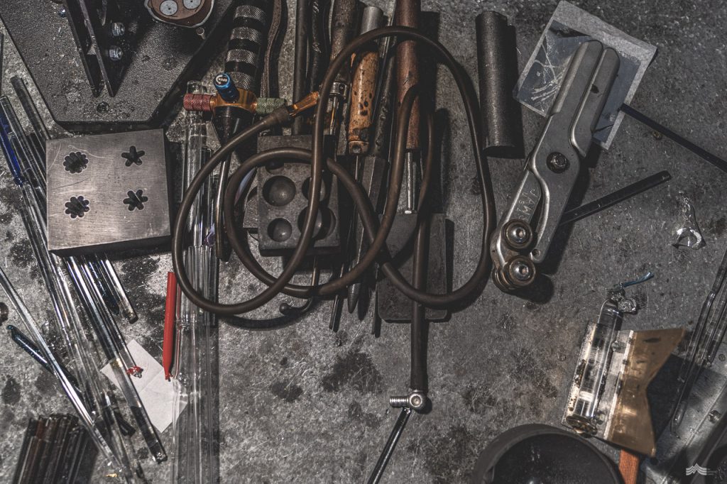 Craig’s workshop is an eclectic feast for the senses. Step inside and lose yourself between the pulsating beat of some heavy tunes, animated murals splashed across the walls, and the simple glow of the lampworking torch. Temperatures rise in here.