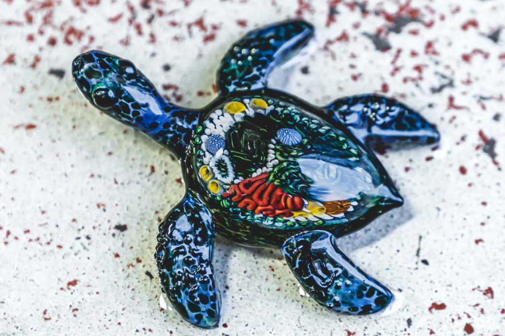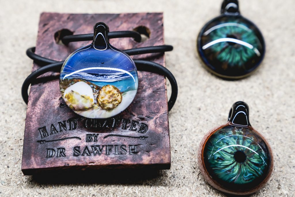 Beads, marbles, jewellery, vessels and dishes might be the standard fare of a glassblower – and certainly pieces mastered by Craig – but this workshop is defined by quirk. Kooky one off pieces are a Dr Sawfish special. Think tobacco pipes shaped like sharks, fried eggs perched on benchtops, glow in the dark panda bears, and crazy Halloween pumpkins bearing teeth. Expect the unexpected. In Craig’s own words, “If I was smart, I’d probably just make the same thing over and over, but it’s not about that for me.”