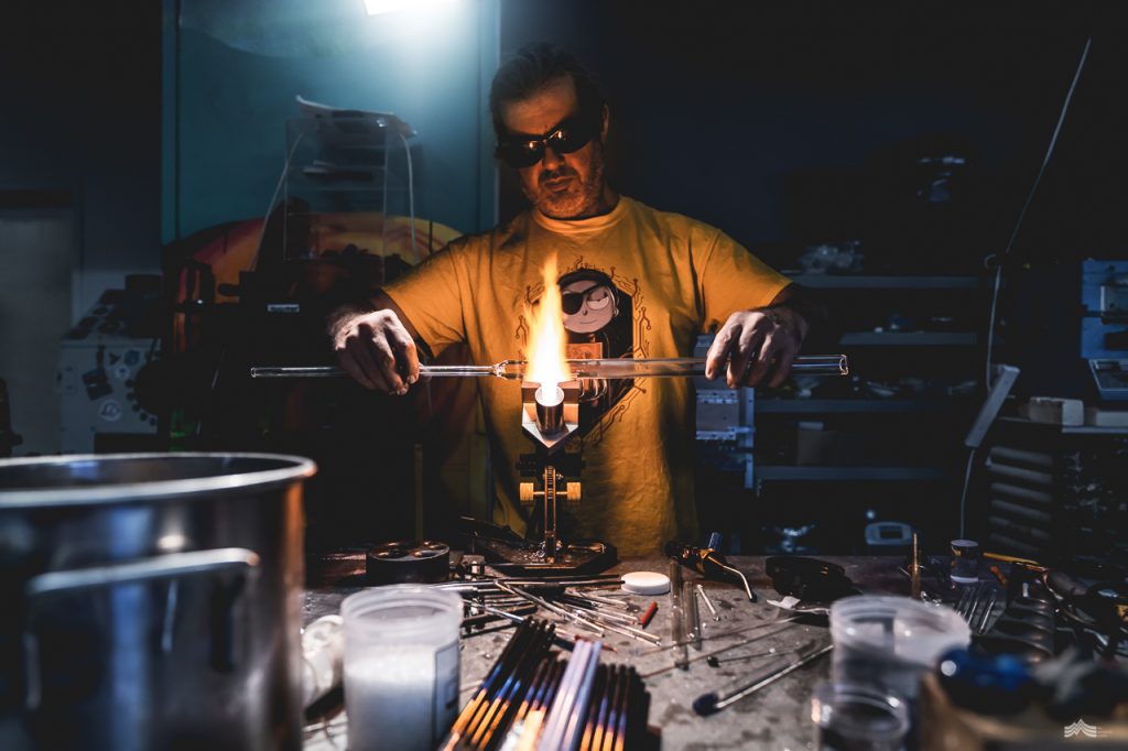 Working with glass had always lingered in the back of Craig’s mind. “I’ve always been fascinated with it,” he nods enthusiastically. “I can clearly recall walking past a glass shop as a kid and it just blowing my mind. I had always just assumed it was out of my league, and I’d never crossed paths with anyone that could teach me.” With a glint in his eye Craig continues, “But one day I just jumped in and bought one hundred dollars’ worth of glass rods and got my hands on a plumbers gas torch. Within ten minutes I knew that this was for me,” he smiles. “I was hooked.”