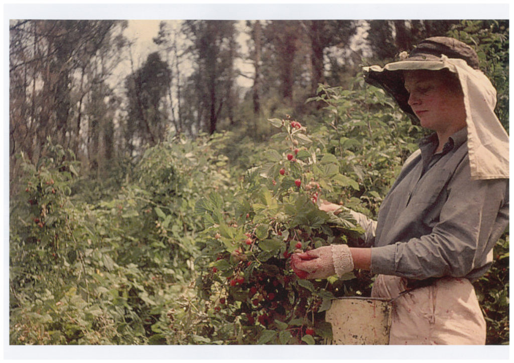 Over the eight years she picked raspberries at Dickensons Creek Road, Winsome would start at daybreak and work through the heat. She wore a “pickers pocket”. These would be emptied into old “kero” tins, which were weighed in at 5pm every day. The fruit was going to the IXL jam factory in Hobart, so it didn’t matter that it got a bit squashed.