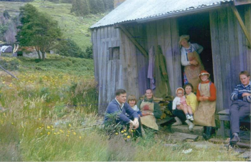 Winsome Duggan, the girl in the orange dress under her sack apron in this 1963 photo, remembers her family (she was the youngest of 11) would get a ride on a truck from their home to the hut on Monday mornings with their supplies for the week. Then on Saturday evening they would take about an hour and a half to walk to their home in Glen Huon. On Sunday, they would go to church, have baths, do the laundry head back on the truck on Monday morning.