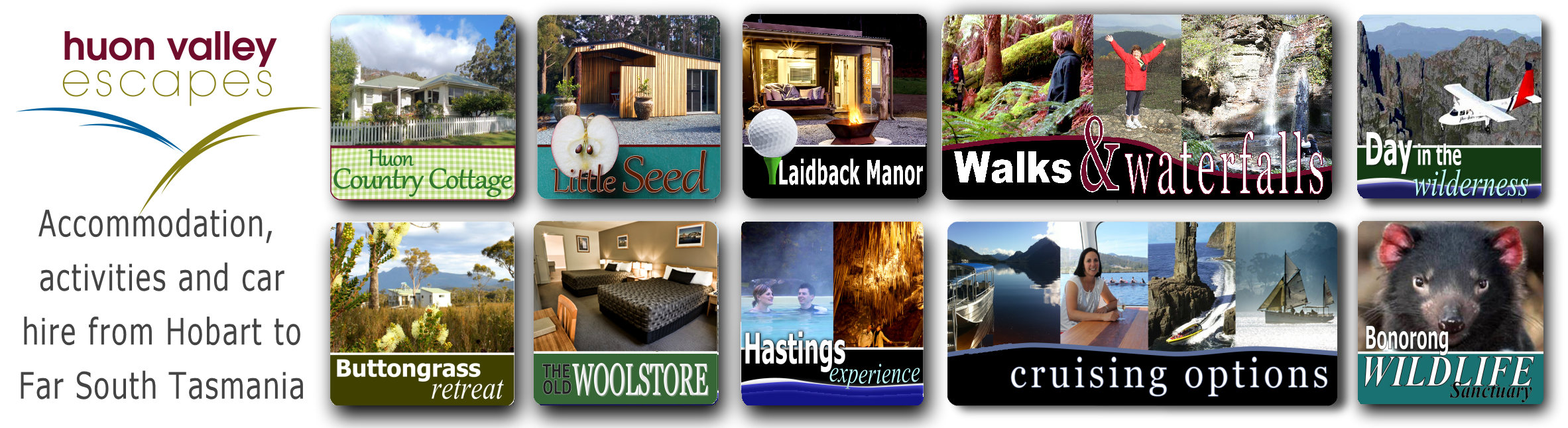 A wide range of activities and accommodation throughout Hobart, Huon Valley, Far South Tasmania and Bruny Island. Make an online booking for a single night or let us help you design an entire holiday: Arrive in Hobart, travel south via Huonville, Geeveston, Dover to Cockle Creek or take a flight to the World Heritage Wilderness of Southwest National Park.